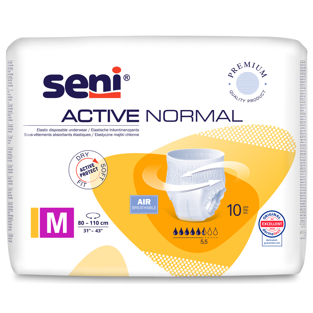 A Seni Active Normal eldobható inkontinencia nadrág praktikus megoldás az aktív érintettek számára, akik értékelik a diszkréciót és a kényelmet. A Seni Active Normal nadrág középsúlyos vizeletinkontinencia esetén nyújt védelmet. Rugalmas és úgy viselhető, mint a hagyományos alsónemű. Alkalmas Alzheimer-kórban vagy más típusú demenciában szenvedő betegek számára is, akik elutasítják a pelenkát. Oldalsó redőkkel és Extra Dry System (EDS) technológiával, amely hatékony védelmet nyújt a szivárgás ellen.