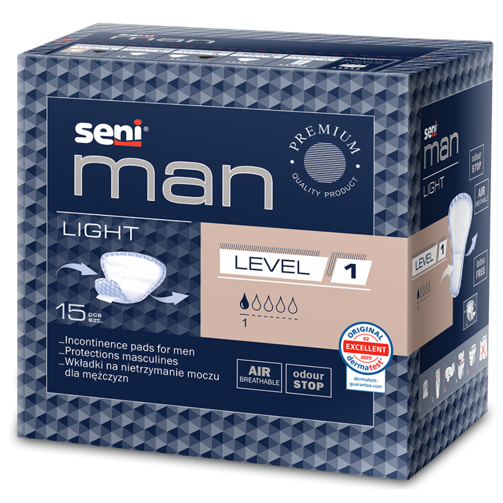 A Seni Man Light Level 1 inkontinencia betétet az aktív életmódot folytató, kényelmet, biztonságot és diszkréciót értékelő férfiak számára hozták létre.